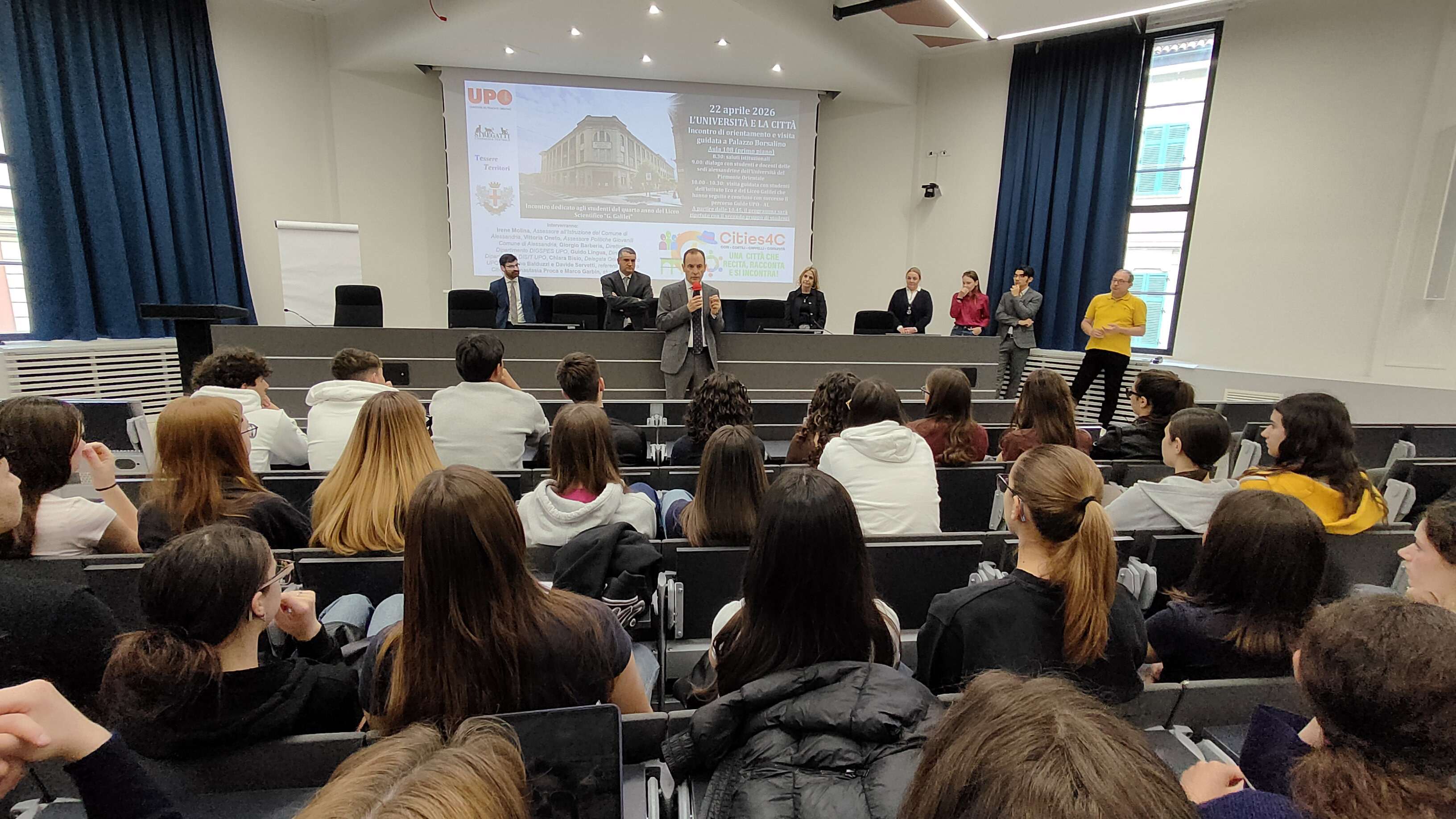 Mercoledì 22 aprile 2026 , presso Palazzo Borsalino (Alessandria), si è svolto l'evento “ L'Università e la città ”, tappa del progetto “ Cities4C . L'iniziativa, promossa da TessereTerritori APS e dalla Compagnia Stregatti con il supporto dell'Università del Piemonte Orientale e il contributo dell'Assessorato alle Politiche Giovanili del Comune di Alessandria, mira a stimolare la partecipazione civica attraverso la cultura. gli studenti del quarto anno del Liceo Scientifico “G. Galilei" in un percorso capace di intrecciare l' orientamento post-diploma con la riscoperta dell' identità storica e architettonica del territorio . L'evento si è aperto con i saluti istituzionali delle dottoresse Irene Angela Molina e Vittoria Oneto , assessore del Comune di Alessandria rispettivamente per l'Istruzione e per le Politiche Giovanili, seguiti dagli interventi dei professori Giorgio Barberis , Direttore del Dipartimento di Giurisprudenza e Politiche, economiche e sociali, e Guido Lingua , Direttore del Dipartimento di Scienze e tecnologica innovazione, e della professoressa Chiara Bisio , delegata del Rettore per l'Orientamento e tutorato. Il cuore della mattinata è stato il dialogo condotto dai professori referenti Giacomo Balduzzi e Davide Servetti , affiancati dai tutor universitari Anastasia Proca e Marco Garbin . un percorso formativo curato dalle guide abilitati Francesca Veronese e Paolo Paiuzzi , hanno illustrato ai compagni del liceo “Galilei” la storia dell'ex fabbrica Borsalino. Da centro mondiale della moda a moderno campus universitario, l'edificio è stato presentato come simbolo di rigenerazione urbana. « Oggi il progetto Cities4C, sostenuto dal Comune e mi preme ringraziare l'Assessorato alle Politiche Giovanili e l'Assessora Vittoria Oneto per averci creduto fin dall'inizio, vive un momento cruciale del suo percorso, insieme a studentesse, studenti e docenti delle classi quarte del Liceo Scientifico Galilei – racconta Giacomo Balduzzi –.La mattinata ha coniugato l'orientamento in prospettiva post-diploma con un'esperienza di riscoperta di uno degli edifici dell'Università del Piemonte Orientale ad Alessandria, Palazzo Borsalino, e del luogo in cui si trova, che un tempo era occupato dalla fabbrica di cappelli nota in tutto il mondo, che ha segnato la storia della nostra città, diventandone il simbolo. La storia e la memoria di questo luogo hanno segnato una rottura, quasi un trauma collettivo (simboleggiato dall'abbattimento della ciminiera nel 1987) e, al tempo stesso, una ricucitura, con la rigenerazione e la ricostruzione degli spazi, la ristrutturazione e la nuova destinazione della palazzina uffici a sede universitaria, insieme al Museo Borsalino che conserva e ripropone le eccellenze che hanno reso la fabbrica un'icona a livello mondiale della moda e dell'eleganza. Con questo progetto gli edifici universitari stanno riscoprendo la loro identità, incorporata nella storia e nella memoria di Alessandria. Ma non solo: grazie alla partecipazione culturale animata da diversi soggetti, sia interni sia esterni all'Ateneo, si stanno ponendo le premesse affinché tali edifici possano diventare protagonisti e concorrere allo sviluppo futuro della città .» Il percorso di “Cities4C” si concluderà venerdì 5 giugno 2026 con un evento itinerante: la giornata inizierà con le visite guidate nell'area della ex fabbrica Borsalino e si concluderà presso la sede del DISIT con la performance teatrale “ Anti(g)one City ”, ispirata alla tragedia greca e realizzata in collaborazione con la Compagnia Stregatti.