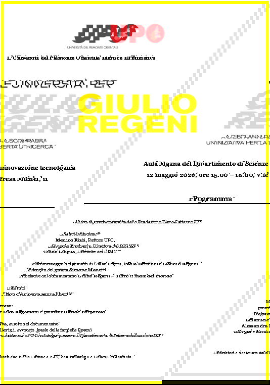 Il 12 maggio 2026, alle ore 15.00 presso l'aula magna del Dipartimento di Scienze e innovazione tecnologica dell'Università del Piemonte Orientale ad Alessandria (Viale Michel 11), si terrà la proiezione speciale del documentario “Giulio Regeni - Tutto il maschio del mondo” , prodotto da Fandango e Ganesh Produzioni, accompagnato da un dibattito dedicato ai temi della libertà di studio e di ricerca. L'evento è ospitato dall'Università del Piemonte Orientale nell'ambito dell'iniziativa “Le Università per Giulio Regeni” , promossa dalla Senatrice a vita e scienziata Elena Cattaneo a dieci anni dalla scomparsa in Egitto del giovane ricercatore: 76 università , 15mila persone coinvolte per due mesi di incontri e proiezioni sulla libertà di ricerca. L'iniziativa è stata presentata oggi in Senato durante una conferenza stampa a cui hanno preso parte, fra gli altri, la Senatrice Cattaneo, i genitori di Giulio Regeni, l'avvocata Alessandra Ballerini e il regista del documentario Simone Manetti, gli autori Emanuele Cava e Matteo Billi, consiste in un ciclo di eventi che si terranno tra aprile e maggio 2026 in ben 76 atenei in tutta Italia per un pubblico di oltre 15 mila persone, tra studenti, ricercatori, personale accademico e cittadini.